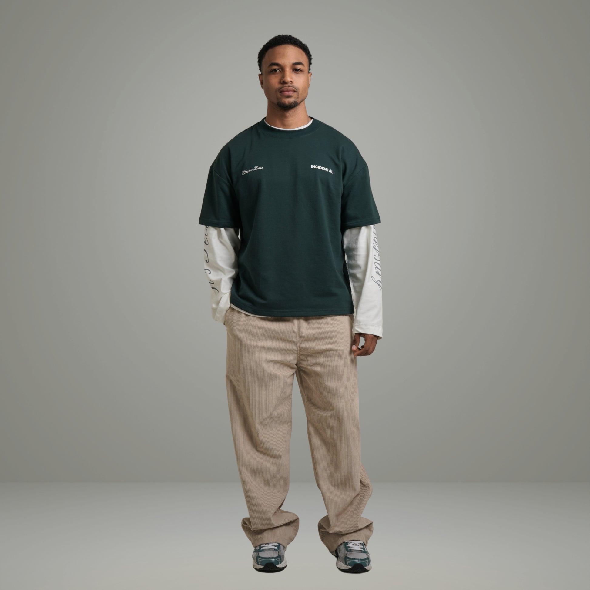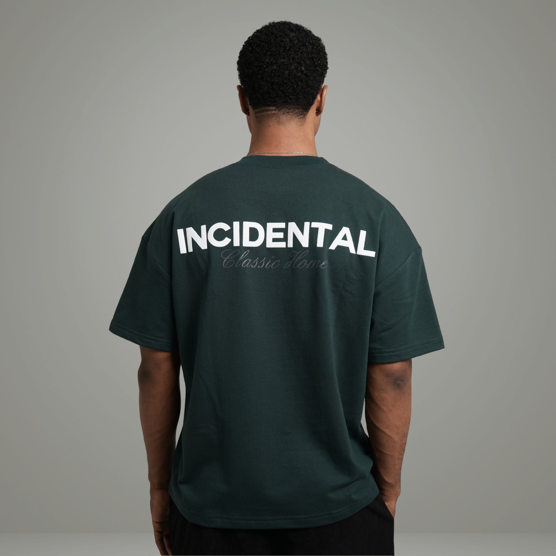 El frente mantiene un diseño minimalista con detalles sutiles; la espalda presenta el sello INCIDENTAL en contraste limpio que eleva toda la pieza.