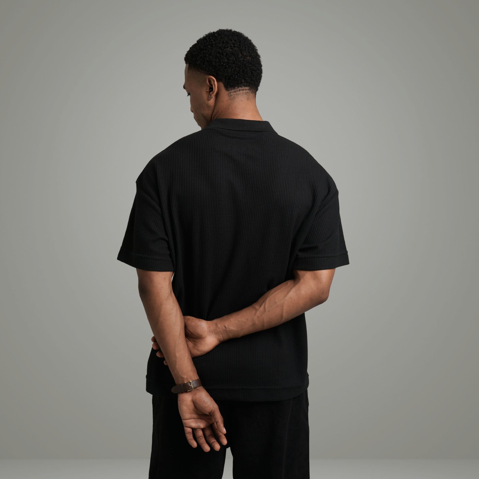 Confeccionada en tejido texturizado que aporta carácter y una sensación táctil premium. Su diseño mantiene una estructura limpia con cuello rígido, tapeta de dos botones y bordado 3D tono a tono.